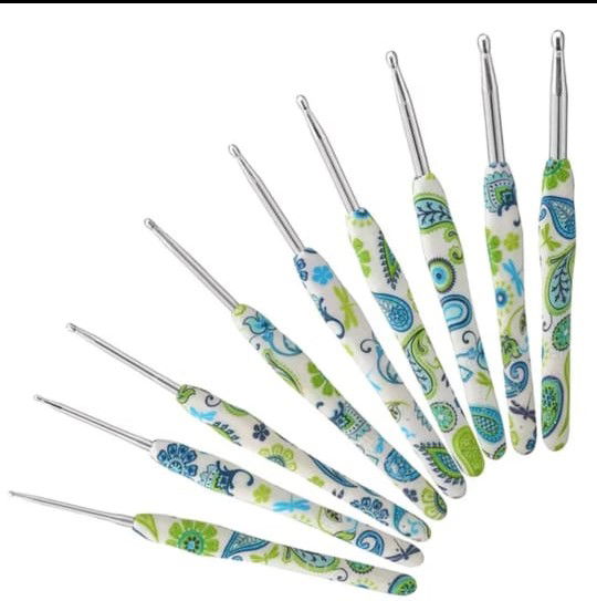 🔹 9 agujas de aluminio con mango de silicona decorado (medidas: 2mm a 6mm).