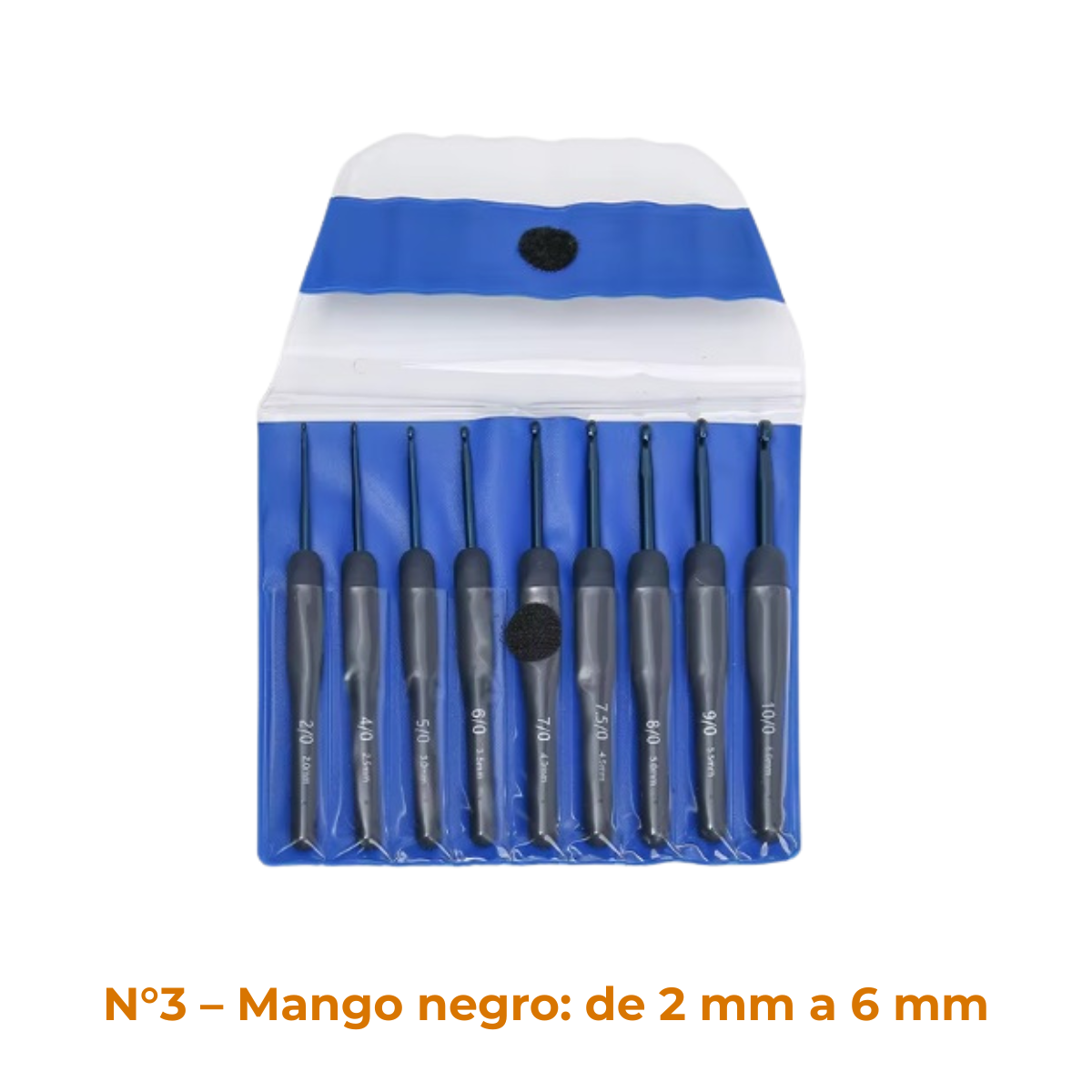 Cada set incluye 9 agujas de diferentes medidas, con mangos suaves y antideslizantes que cuidan tus manos y muñecas, ideales tanto para principiantes como para tejedoras avanzadas.