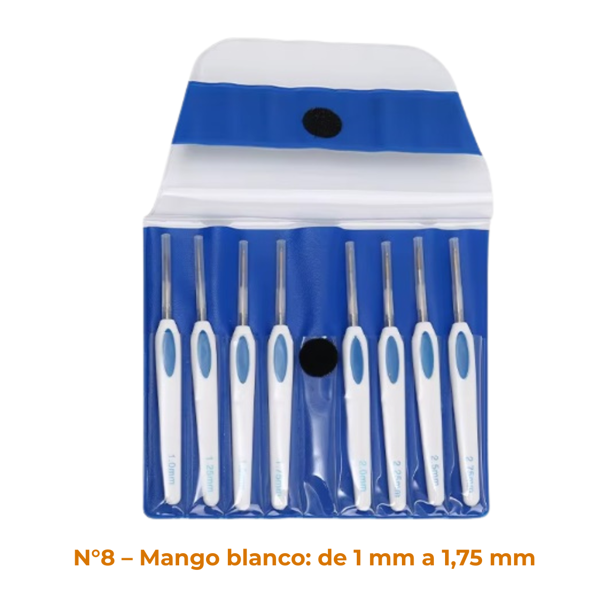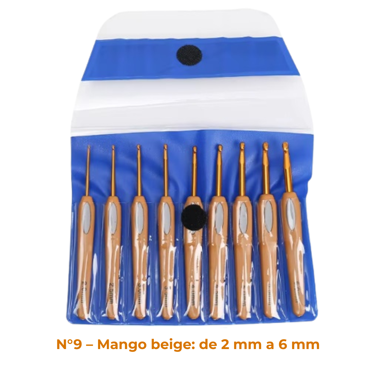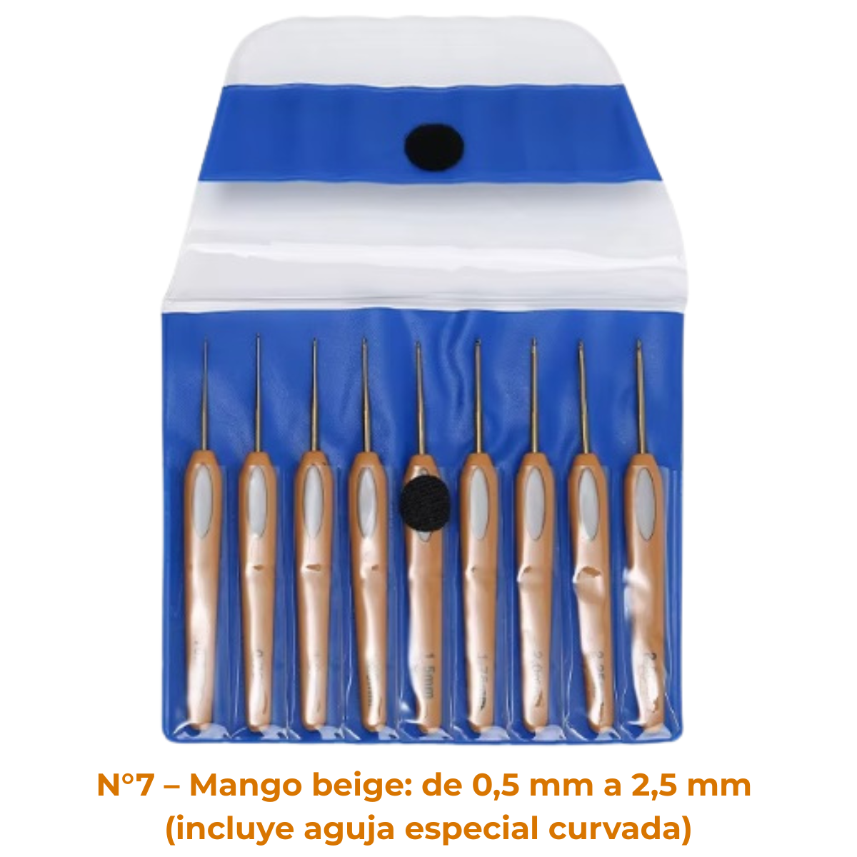🤍 N°7 – Mango beige | Medidas de 0,5 mm a 2,5 mm (incluye aguja especial de 0,5 mm con gancho curvo para microcrochet y detalles finos)